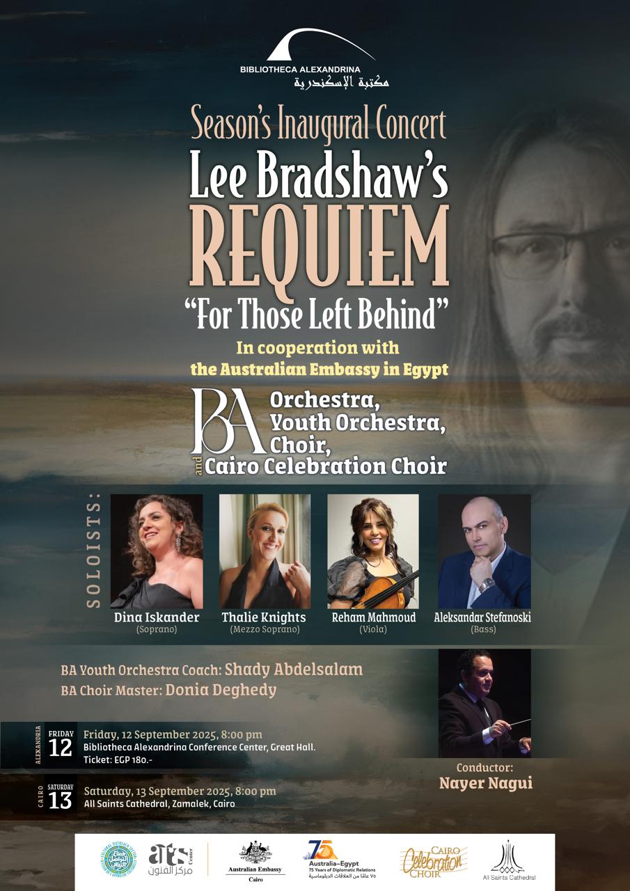 تفتتح أوركسترا مكتبة الإسكندرية موسمها الفني ٢٠٢٥/٢٠٢٦ بعمل كورالي ضخم يقدم لأول مرة للمؤلف الأسترالي المعاصر لي برادشو، الحاصل على عدة جوائز عالمية، تحت عنوان “ريكويم لأولئك المتروكين خلفًا”، وذلك بالتعاون مع السفارة الأسترالية بالقاهرة.