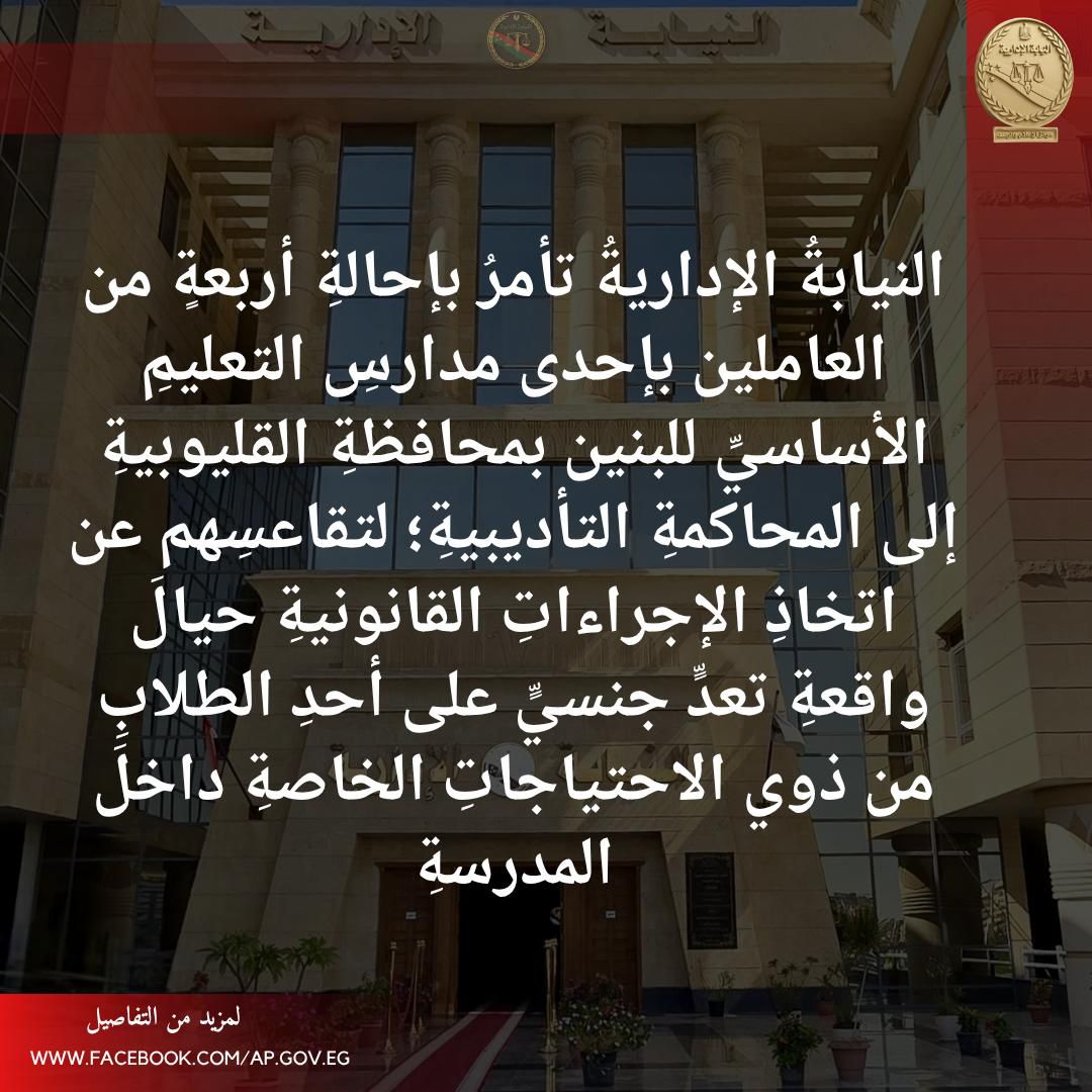 وكان مركزُ الإعلامِ والرصدِ بالنيابةِ الإداريةِ قد رصد ما تم تداوله عبر عددٍ من المواقعِ الإلكترونيةِ حول واقعةِ قيامِ طالبٍ بالصفِّ الثاني الإعداديِّ بإحدى مدارسِ البنينِ للتعليمِ الأساسيِّ بمحافظةِ القليوبيةِ بالتعدي جنسيًّا على طالبٍ آخرَ من ذوي الاحتياجاتِ الخاصةِ داخلَ مقرِّ المدرسةِ، وأثناءَ اليومِ الدراسيِّ، وعلى الفورِ تم إخطارُ النيابةِ الإداريةِ ببنها – القسمِ الثالثِ – بالواقعةِ، التي تولَّت التحقيقَ العاجلَ فيها.