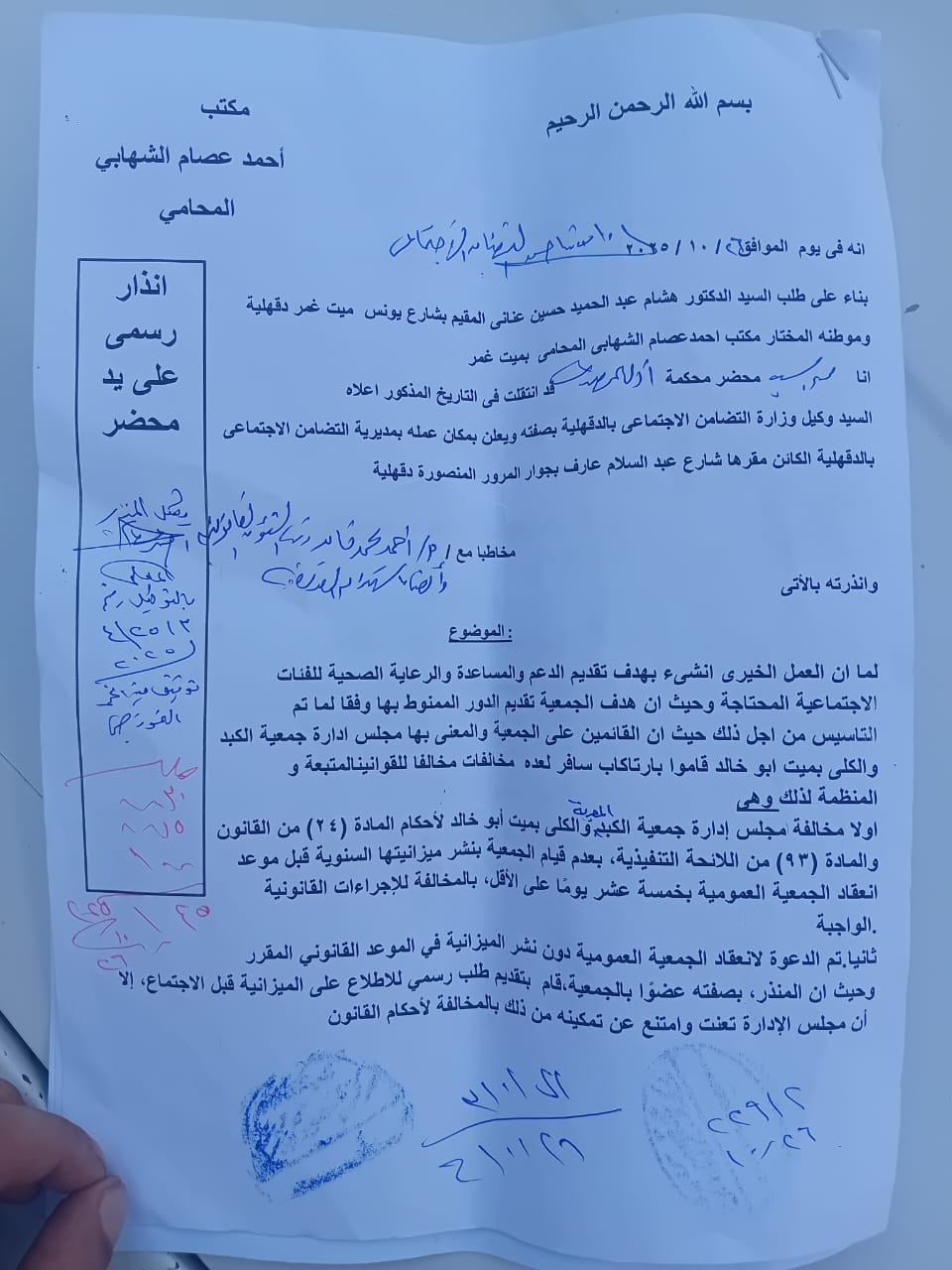 تتصاعد أزمة الحسابات الختامية للجمعية المصرية لمرضى الكبد والكلى بميت أبو خالد – مركز ميت غمر بمحافظة الدقهلية – بعد أن تم إرسال شكاوى وإنذارات على يد محضر إلى إدارة التضامن بميت غمر ومديرية التضامن بالدقهلية، للتحذير من انعقاد الجمعية العمومية لاعتماد الحسابات الختامية عن أعوام 2023 / 2024 / 2025، حيث اعتبر مقدمو الشكاوى أن إجراءات الانعقاد مخالفة للقانون وتهدد مبدأ الشفافية الذي تنادي به الدولة.