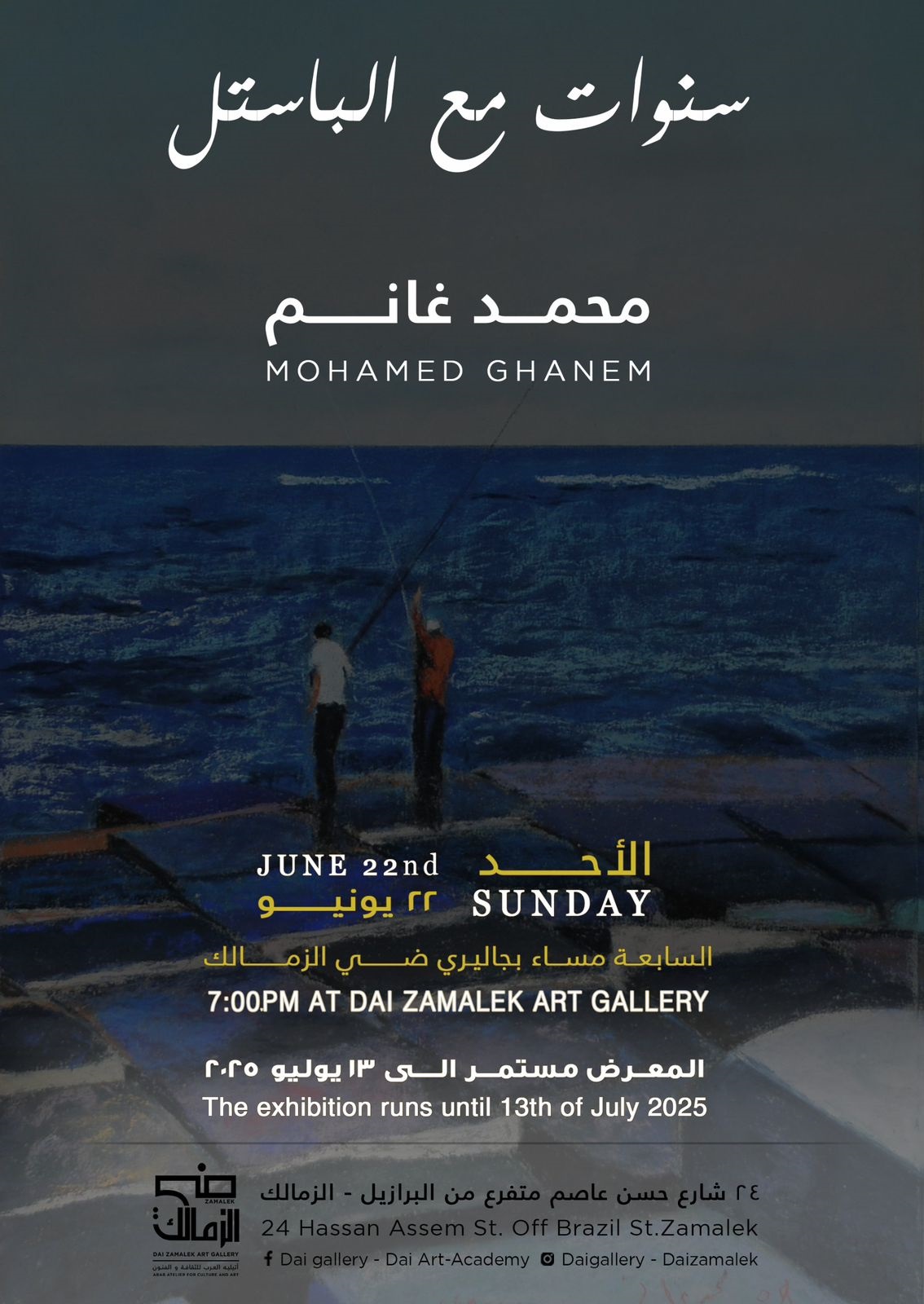 يشهد جاليري ضي الزمالك، في السابعة من مساء الأحد المقبل ٢٣ يونيو، افتتاح المعرض الشخصي للدكتور محمد غانم بعنوان “سنوات مع الباستيل”، ومعرض “مختارات عربية” الثامن ويضم مقتنيات الجاليري لنخبة من الفنانين التشكيليين المصريين والعرب المعاصرين.