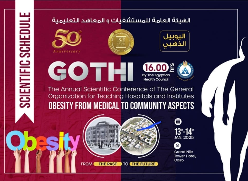 تحت رعاية أ. د. خالد عبد الغفار نائب رئيس الوزراء وزير الصحة والسكان، تعقد الهيئة العامة للمستشفيات والمعاهد التعليمية مؤتمرها العلمى السنوى تحت عنوان ” السمنة .. من الطب إلى المجتمع ” فى الفترة من ١٣ – ١٤ يناير ٢٠٢٥ بفندق جراند نايل تاور بالقاهرة.