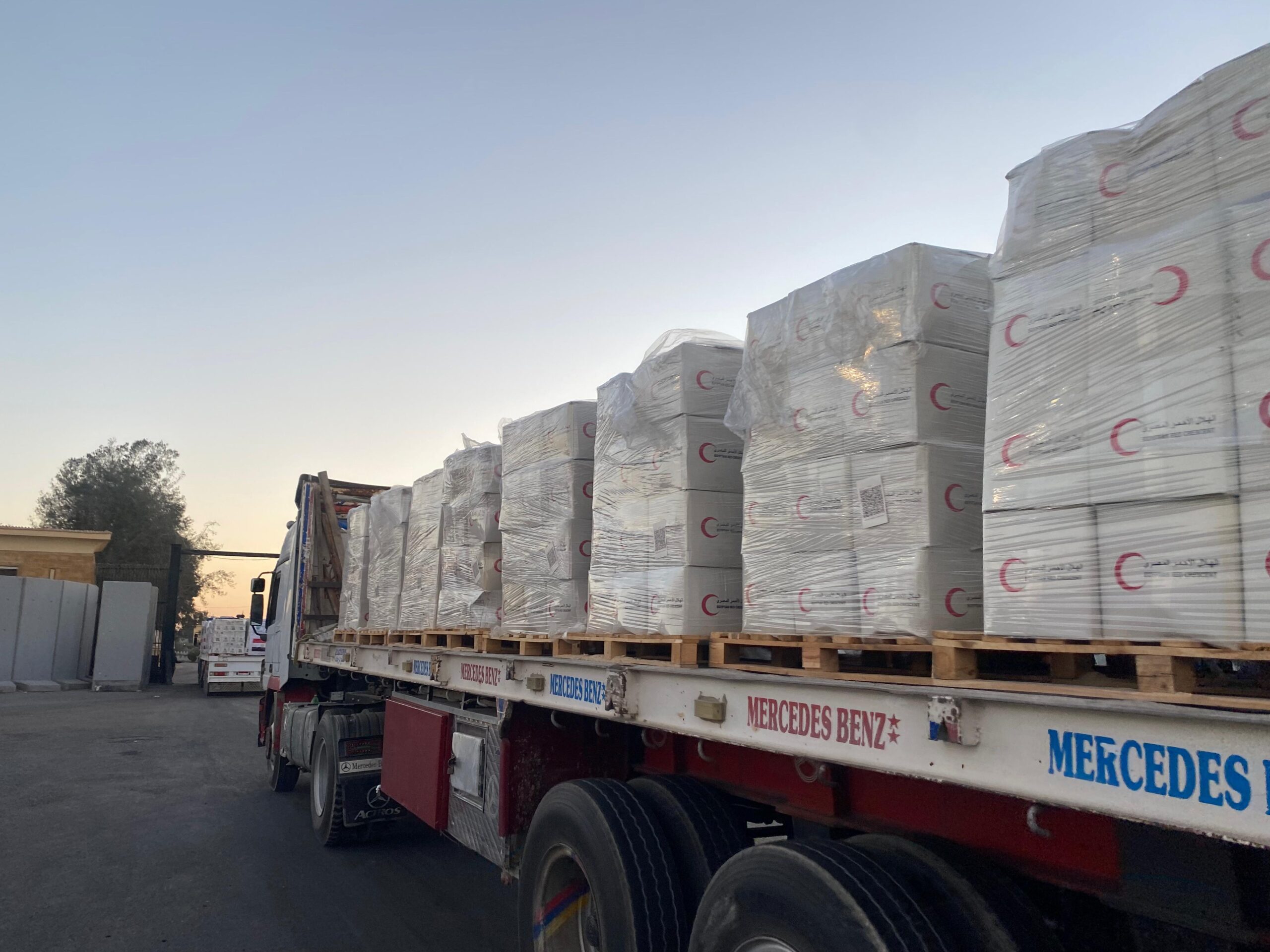 ويتواجد الهلال الأحمر المصري كآلية وطنية لتنسيق وتفويج المساعدات إلى غزة، على الحدود منذ بدء الأزمة حيث لم يتم غلق معبر رفح من الجانب المصري نهائيًا، وواصل تأهبه فى كافة المراكز اللوجستية وجهوده المتواصلة لدخول المساعدات التي بلغت أكثر من نصف مليون طن من المساعدات الإنسانية والإغاثة، وذلك بجهود  35 ألف متطوع بالجمعية.