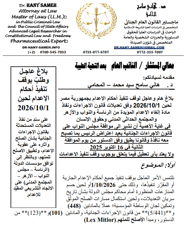 تقدّم الدكتور هاني سامح، المحامي الحقوقي ، بعريضة عاجلة إلى المستشار النائب العام حملت رقم 1404785، طالب فيها بوقف تنفيذ جميع أحكام الإعدام في جمهورية مصر العربية حتى الأول من أكتوبر 2026، استنادًا إلى التعديلات المستحدثة بقانون الإجراءات الجنائية التي أقرها مجلس النواب في جلسته المنعقدة بتاريخ 16 أكتوبر الماضي، والتي تضمنت نصوصًا تجيز الصلح في جرائم القتل العمد وما في حكمها، وترتّب على ذلك وجوب إلغاء عقوبة الإعدام .
