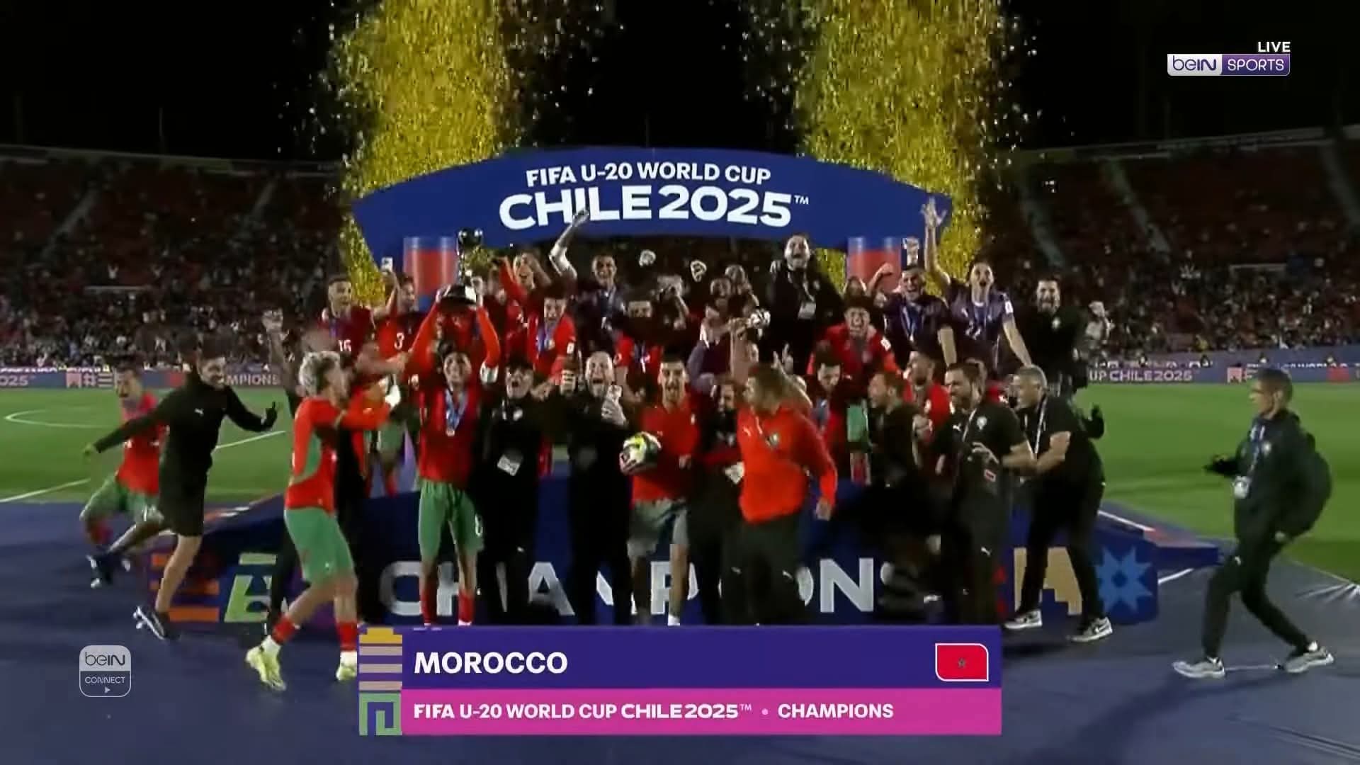 توج المغرب بكأس العالم لكرة القدم للشباب 2025 في تشيلي بعد فوزه 2-0 على الأرجنتين، بفضل ثنائية ياسر زابيري. المغرب أصبح أول بلد عربي وثاني إفريقي يحقق اللقب، مع تألق دفاعه وحارسه إبراهيم جوميز. الأرجنتين خسرت نهائي البطولة للمرة الثانية بعد 1983.