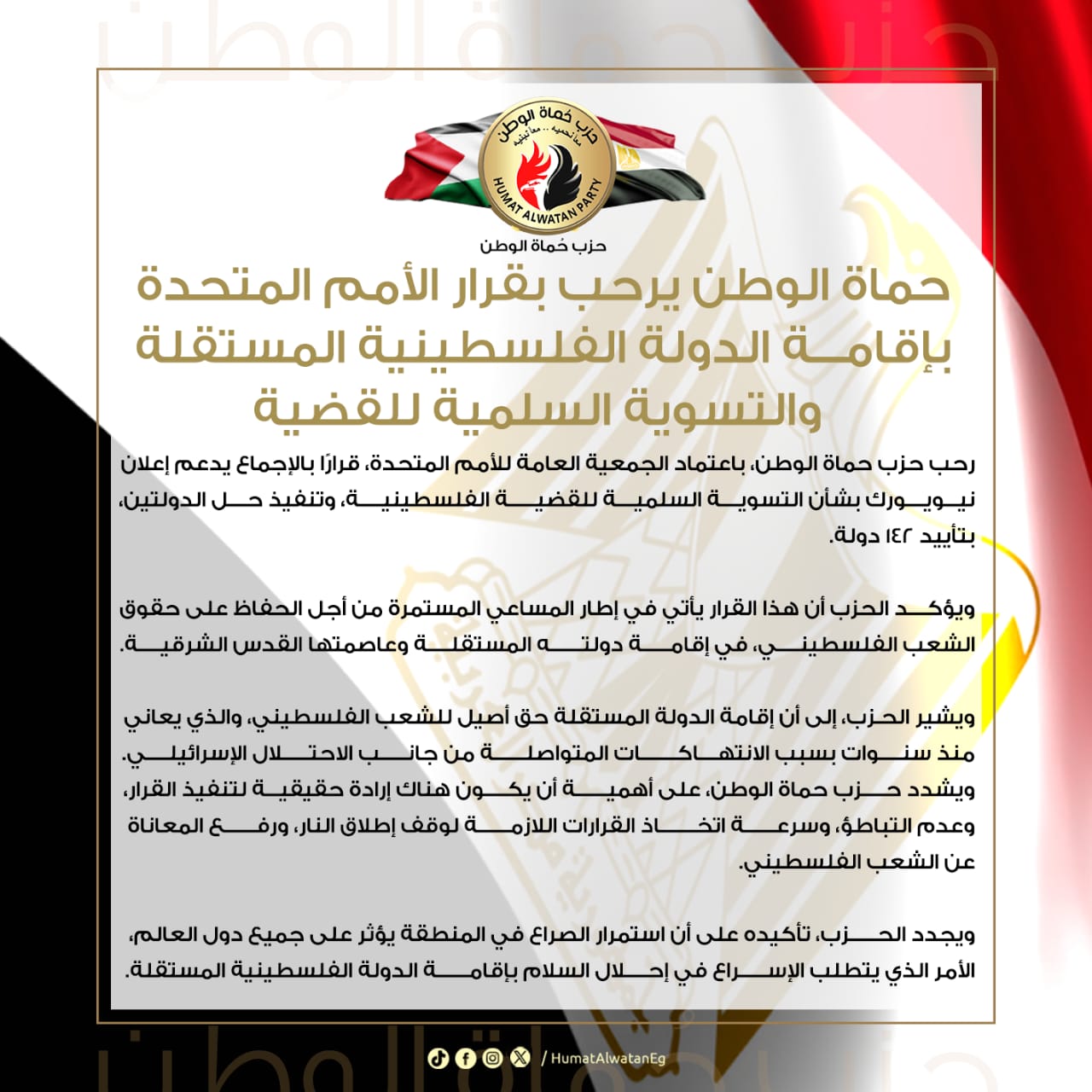 رحب حزب حماة الوطن، باعتماد الجمعية العامة للأمم المتحدة، قرارًا بالإجماع يدعم إعلان نيويورك بشأن التسوية السلمية للقضية الفلسطينية، وتنفيذ حل الدولتين، بتأييد 142 دولة.
