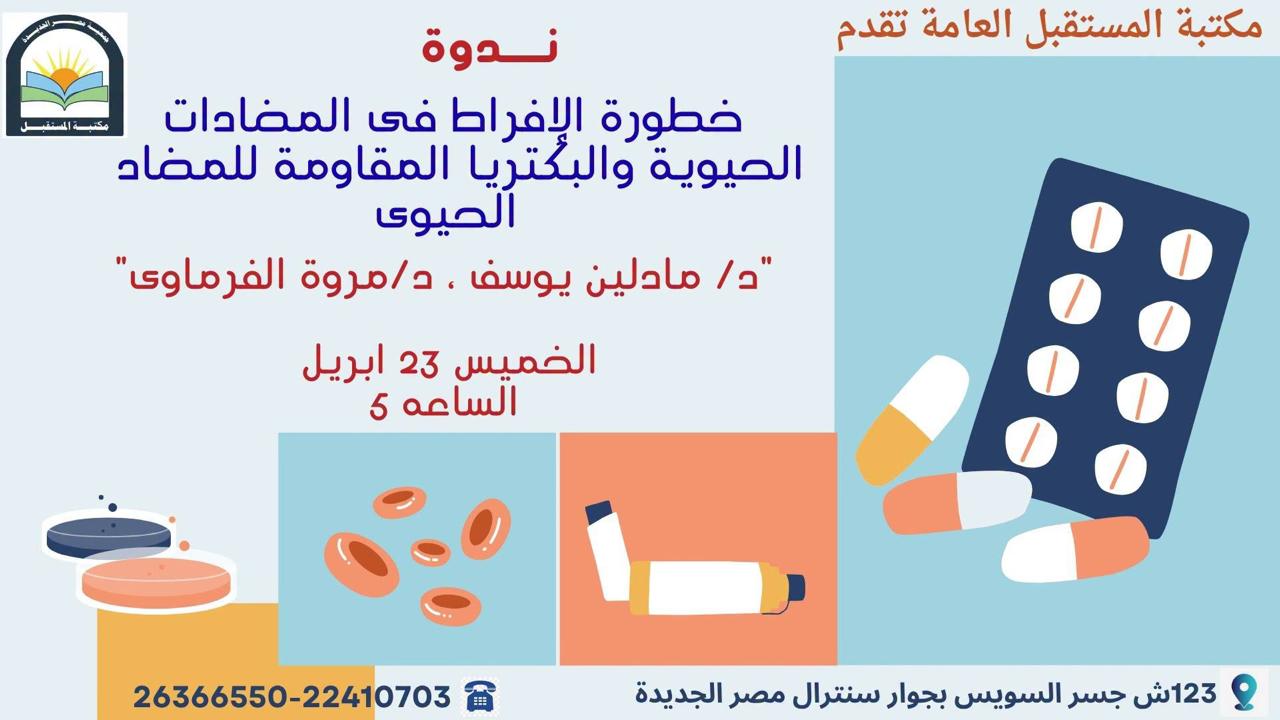 تنظم مكتبة المستقبل ،إحدى المنصات الثقافة بجمعية مصر الجديدة ندوة بعنوان (( خطورة الافراط فى المضادات الحيوية والبكتريا المقاومة للمضاد الحيوى)) ، وذلك فى الساعة ٥ من مساء بعد غد الخميس ، تقام الندوة برعاية الدكتورة سهام الجوهرى رئيس مجلس إدارة جمعية مصر الجديدة.