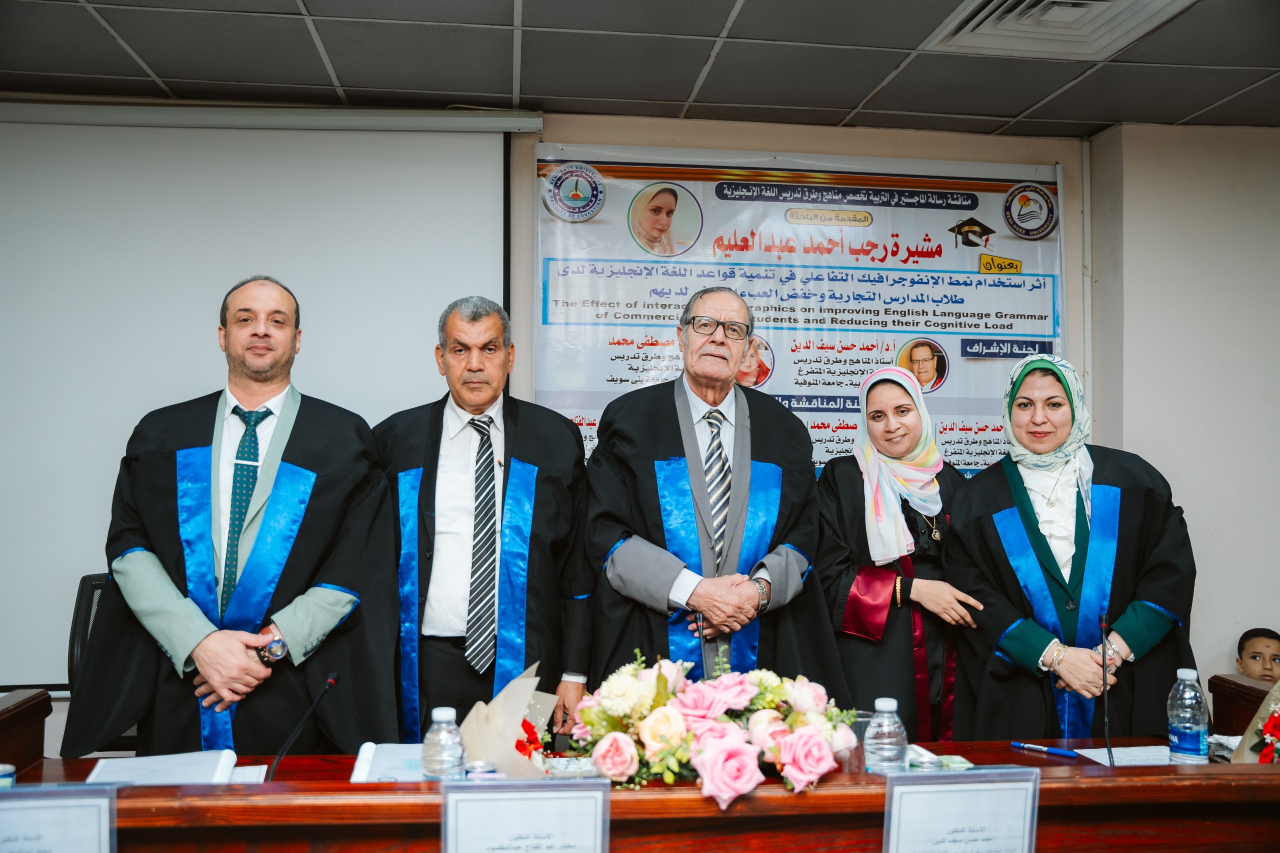 وناقشت الباحث مشيرة رجب أحمد عبد العليم، الباحثة رسالة الماجستير والتي جاءت بعنوان” اثر استخدام نمط الإنفوجرافيك التفاعلي في تنمية قواعد اللغة الإنجليزية لدى طلاب المدارس التجارية وخفض العبء المعرفي لديهم”، والذي يستهدف تنمية قواعد اللغة الإنجليزية لدي الطلاب.
