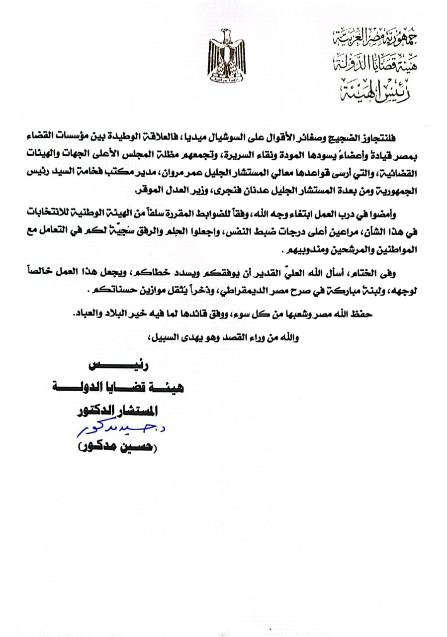 وتضمن بيان هيئة قضايا الدولة أنه مع انطلاق المرحلة الثانية من انتخابات مجلس النواب، يسعدني – بصفتي رئيسًا للهيئة وزميل درب – أن أعبّر لكم عن خالص التقدير وعظيم الاعتزاز بما بذلتموه من جهود مضنية خلال إشرافكم على المرحلة الأولى من الاستحقاق الانتخابي.