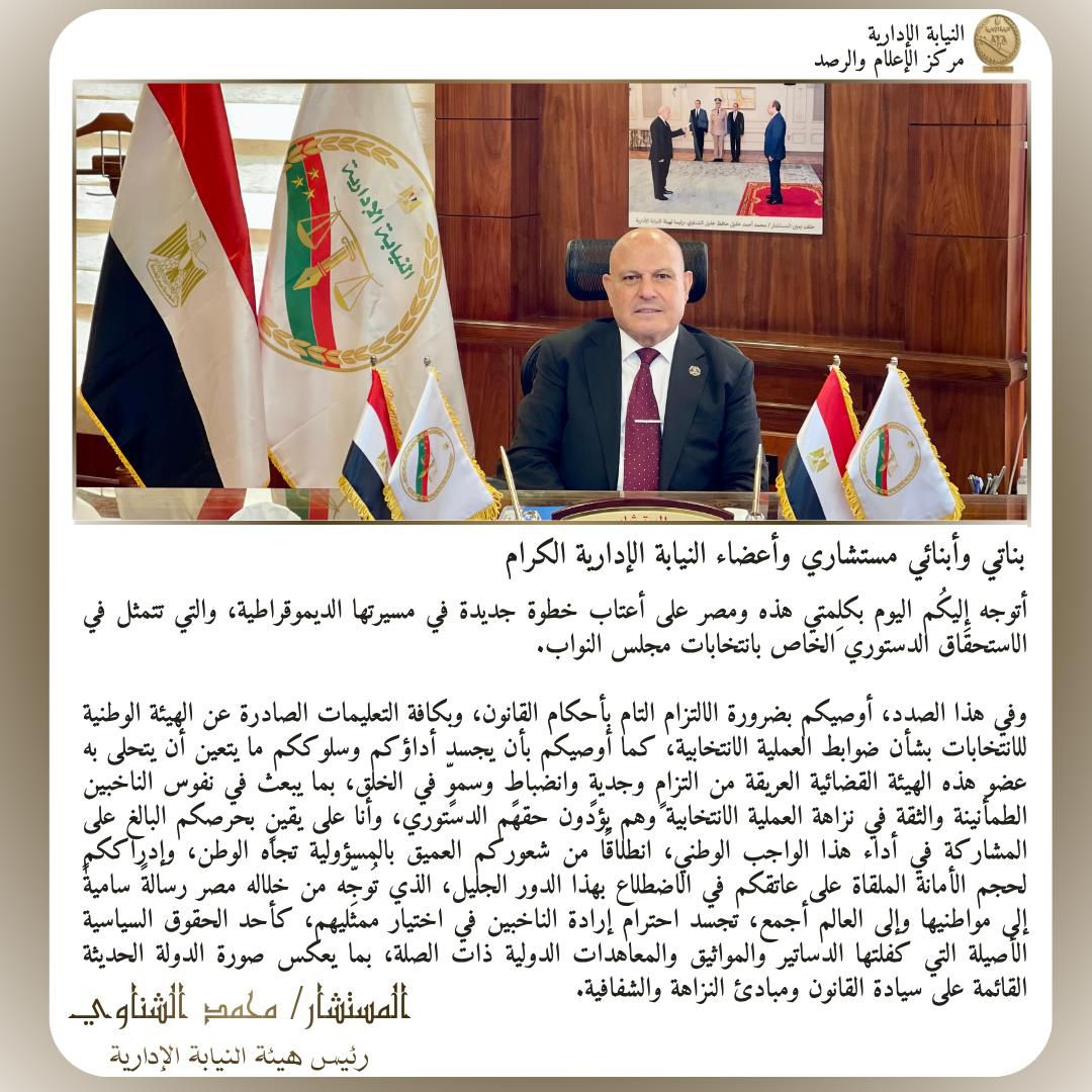 وجه  المستشار محمد الشناوي – رئيس هيئة النيابة الإدارية،  رسالة لأعضاء بمناسبة الإشراف القضائي على انتخابات مجلس النواب ٢٠٢٥