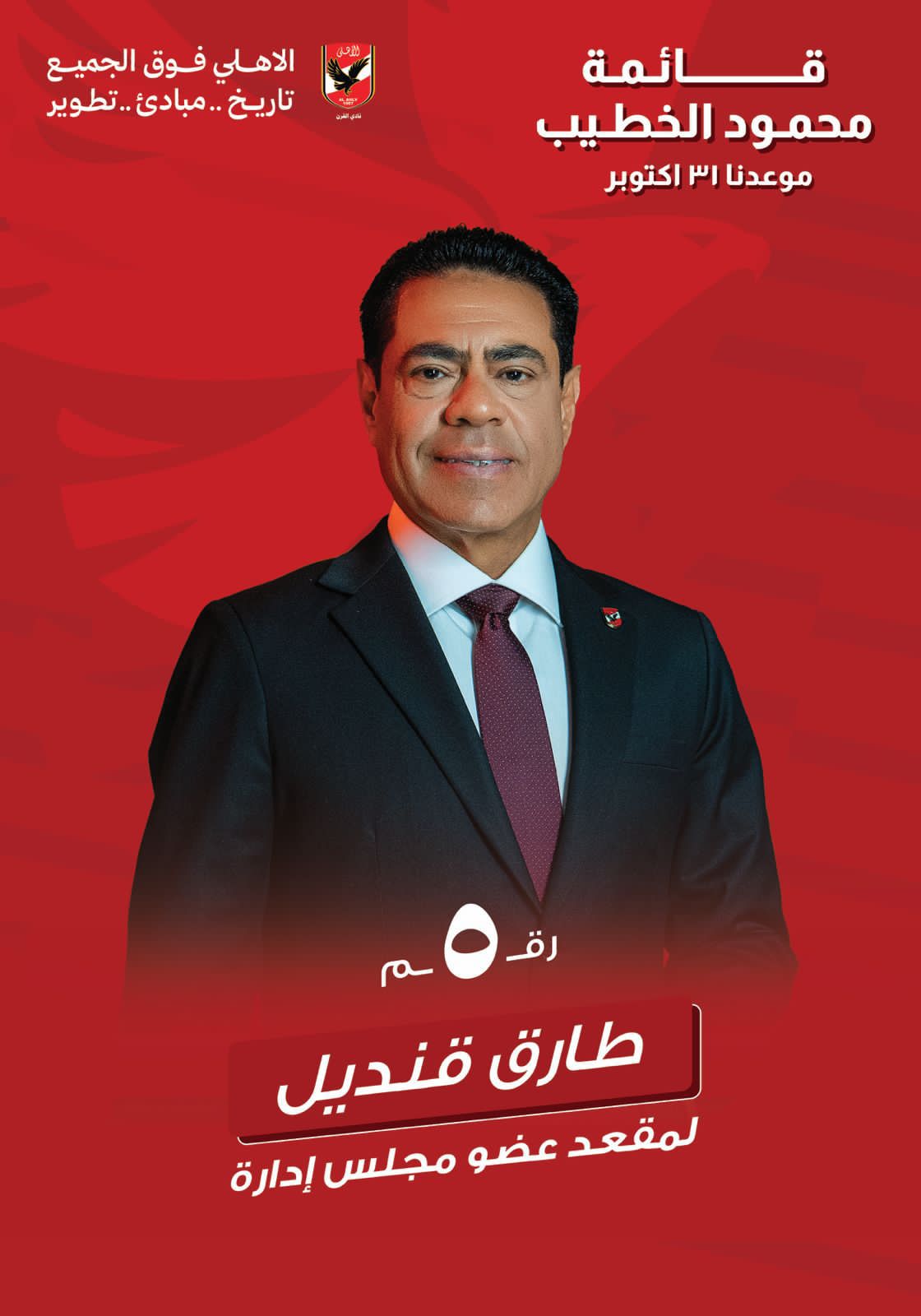 كشف طارق قنديل، عضو مجلس إدارة النادي الأهلي ومدير عام اول بالمصرف العربي الدولي AIB، عن ترشحه لعضوية مجلس إدارة النادي ضمن قائمة الكابتن محمود الخطيب في انتخابات الأهلي المقرر عقدها يوم 31 أكتوبر 2025، تحت شعار «تكملة المشوار.. تنمية واستثمار».