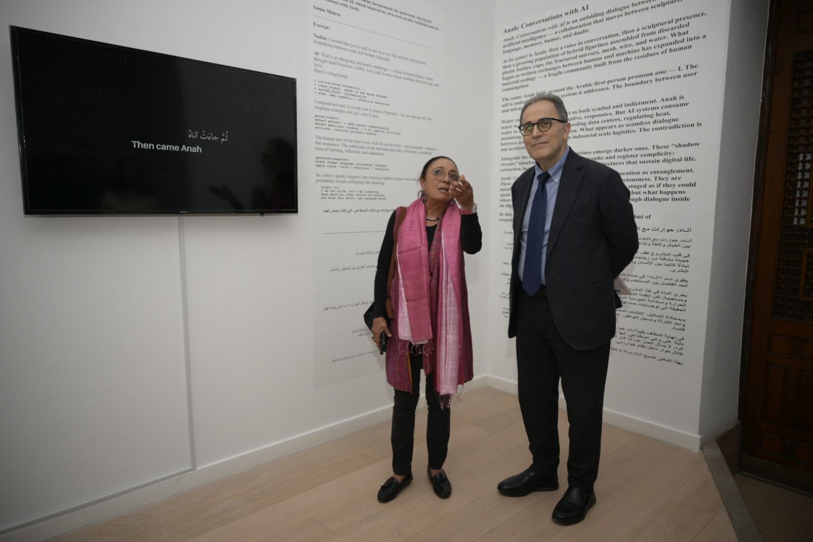 وفي قاعة المستقبل بالجامعة، يقام معرض “أنّا: محادثات مع الذكاء الاصطناعي”، للفنانة سامية محرز، خريجة الجامعة عامي 1977 و1979، بالتعاون مع خبير الوسائط المتعددة عمرو علي. يستكشف المعرض الجوانب الإنسانية للتفاعل مع الذكاء الاصطناعي من خلال مجسمات منحوتة مصنوعة من مواد تم إعادة تدويرها مثل الزجاجات البلاستيكية، إلى جانب عروض بصرية تفاعلية وتجارب صوتية ونصوص يولدها الذكاء الاصطناعي بشكل لحظي. كما يمنح المعرض الذكاء الاصطناعي حضورًا ملموساً عبر شخصية افتراضية تدعى “أنّا”، في إشارة إلى الضمير العربي “أنا”.