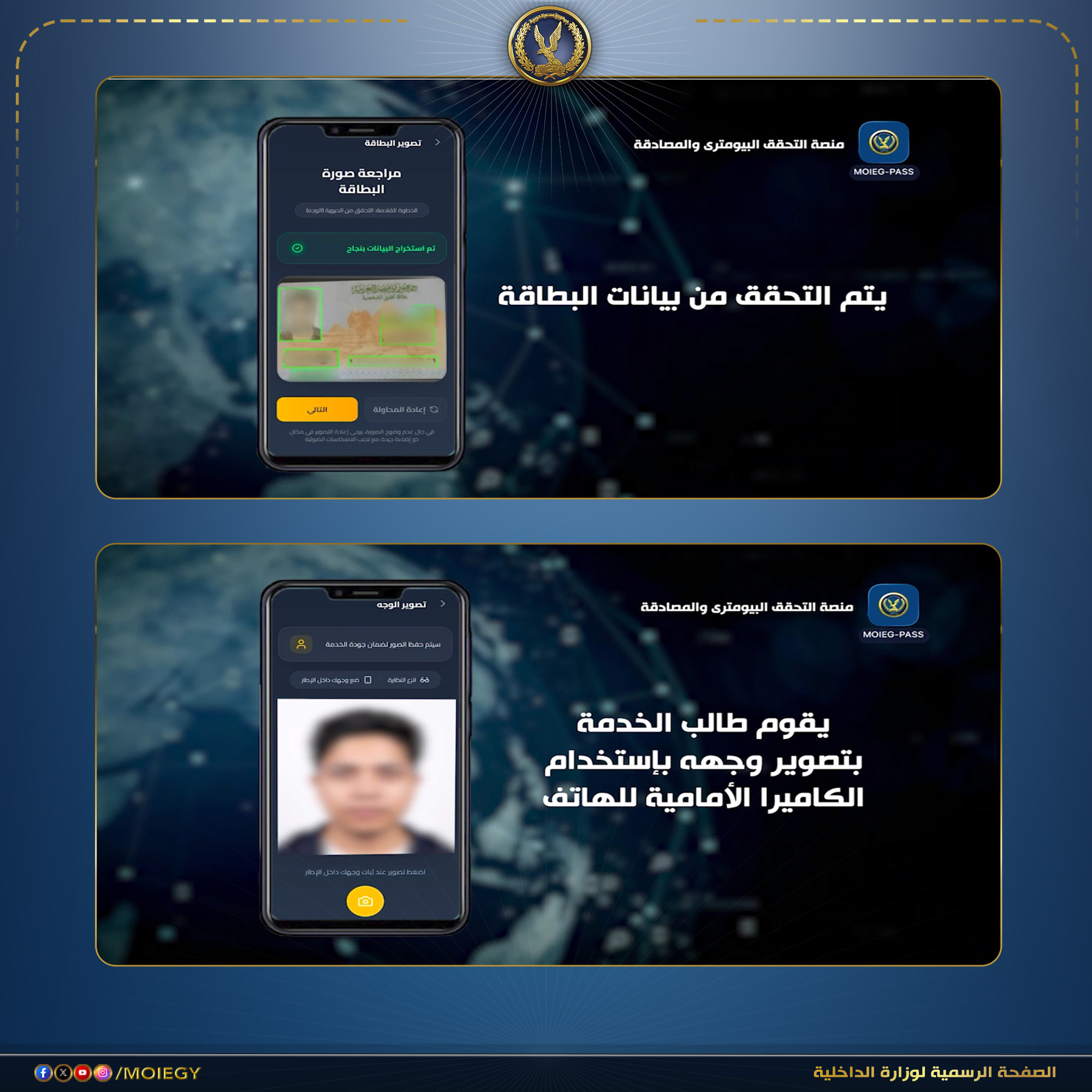 تماشياً مع سياسة الدولة نحو التحول الرقمى وتعظيم الإستفادة من تقنيات الذكاء الإصطناعى لتيسير الخدمات الإلكترونية المقدمة للمواطنين .. إستحدثت وزارة الداخلية ولأول مرة فى مصر منصة وطنية موحدة للتحقق البايومترى والمصادقة اللحظية بإستخدام خوارزميات التعرف على الوجوه ، وهو منتج وطنى متكامل تم تطويره بسواعد مصرية وفقاً لأحدث المعايير والتقنيات العالمية بهدف تأمين بيانات المواطنين وحماية تعاملاتهم مع الخدمات الخاصة بوزارة الداخلية على شبكة الإنترنت .. والخدمة متاحة لكافة المواطنين ويمكن إتاحتها للجهات المختلفة من خلال تحميل التطبيق الخاص بالتحقق البايومترى والمصادقة MOIEG-PASS على الهواتف الذكية .