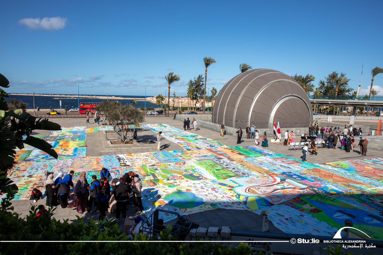 استضافت مكتبة الإسكندرية صباح اليوم، احتفالية كبرى للكشف عن “أكبر لوحة مرسومة في العالم” بالساحة الخارجية للمكتبة، والتي شارك في إبداعها طلاب المدارس المصرية اليابانية (EJS) بالتعاون مع أطفال من دولة اليابان، وذلك بتنظيم مشترك بين جمعية “Earth Identity Project” اليابانية ومكتبة الإسكندرية، وبالتنسيق مع وزارة التربية والتعليم وسفارة اليابان بالقاهرة، في حدث يجسد أسمى معاني التعاون الثقافي والتربوي بين البلدين.