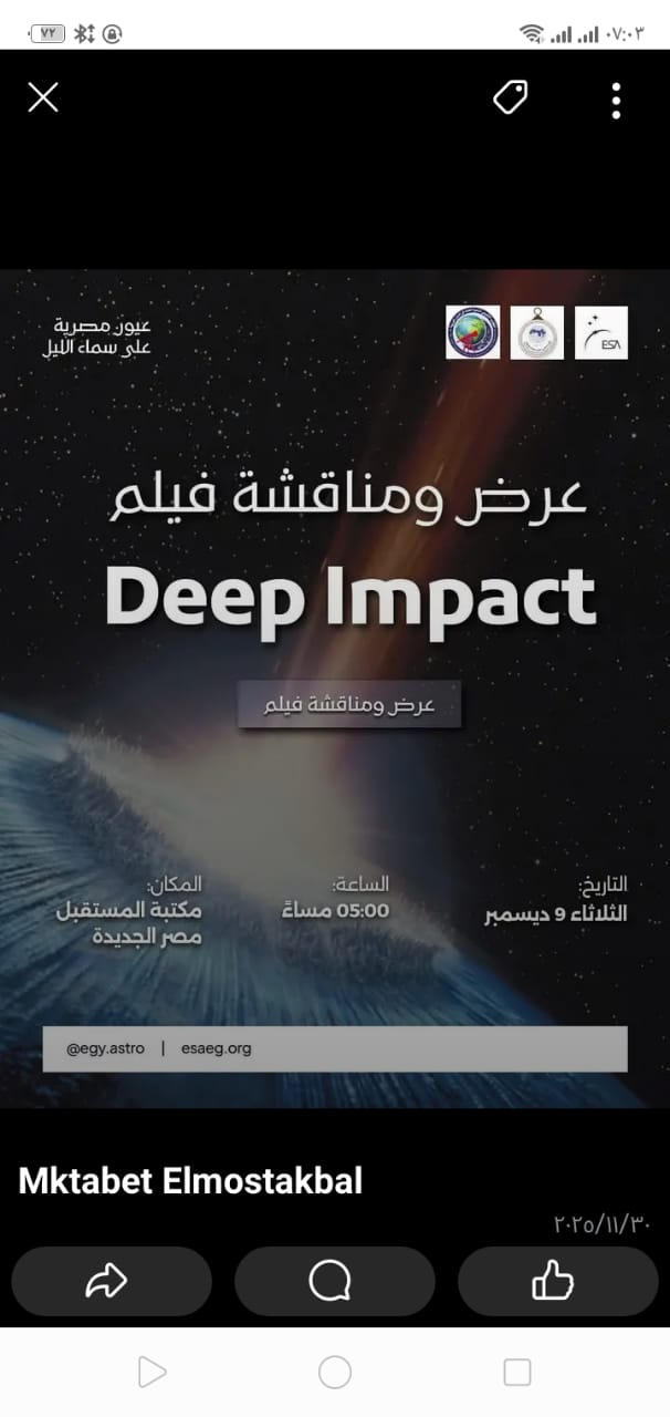 ندوة لمناقشة وعرض فيلم «Deep Impact» بمكتبة المستقبل غدا