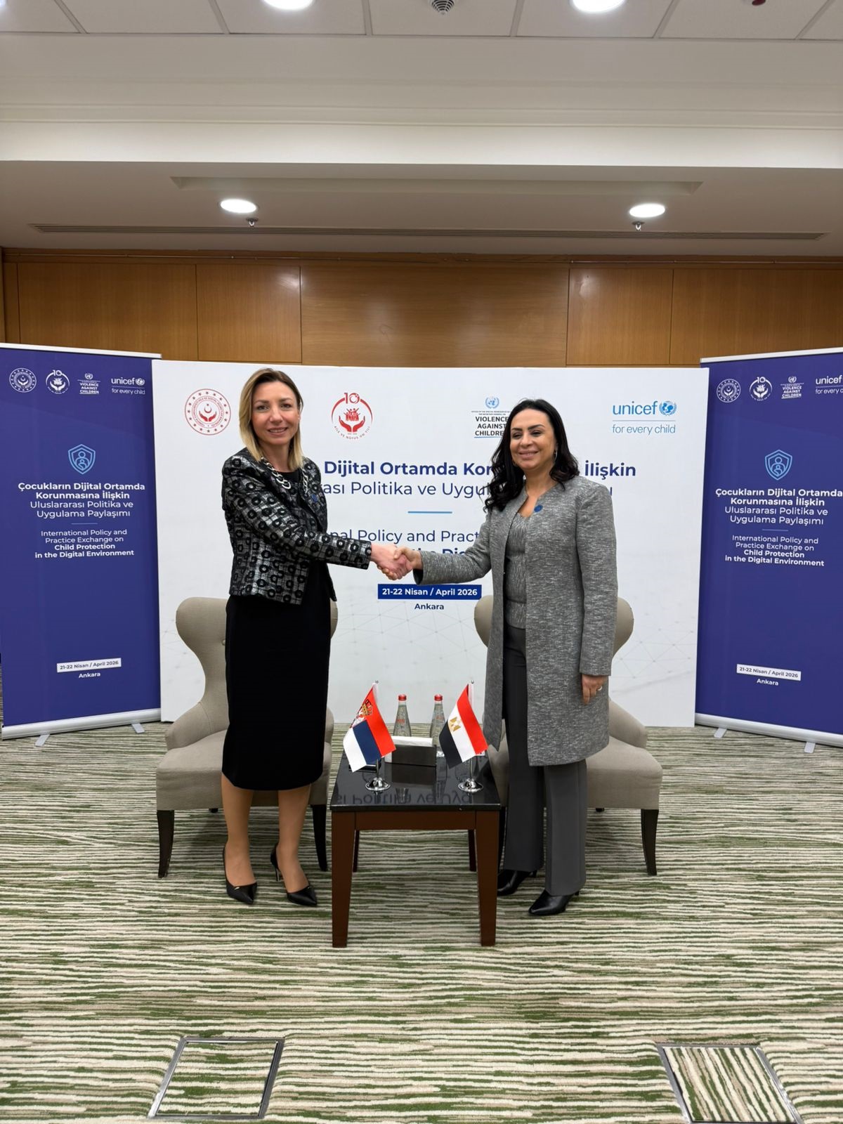 التقت الدكتورة مايا مرسي وزيرة التضامن الاجتماعي، السيدة تانجانا ماكورا وزيرة المساواة بين الجنسين والوقاية من العنف ضد النساء والتمكين الاقتصادي والسياسي للنساء بجمهورية صربيا، وذلك على هامش مشاركتها في اجتماع المائدة المستديرة حول “تبادل السياسات والممارسات الدولية بشأن حماية الطفل في البيئة الرقمية” بأنقرة، بحضور دينا الصيرفي مساعدة وزيرة التضامن الاجتماعي للتعاون الدولي والعلاقات والاتفاقات الدولية.